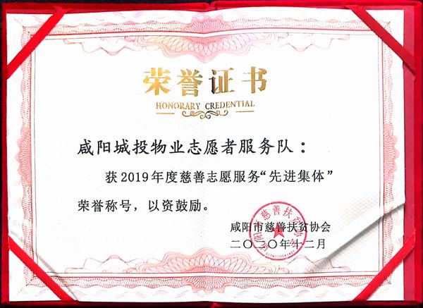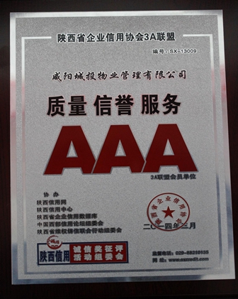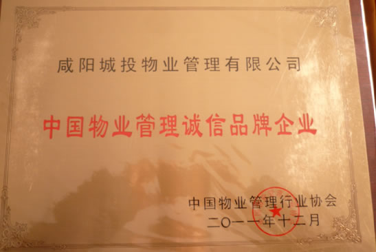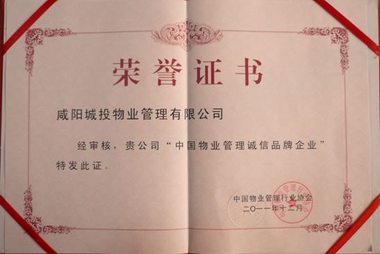 十年磨劍,劍成峰。2011年被中國物業管理行業協會授予中國物業管理誠信品牌企業,2014年榮獲陜西省企業信用協會3A聯盟會員單位,2014年在國家園林城市創建工作中被咸陽市委、市政府評為“先進基層單位”,2012年-2017年連續5年被上級工會授予“先進集體”,2015年被共青團咸陽市委授予“青年文明號”標兵單位,2015-2017年連續3年被咸陽市扶貧協會授予“先進集體”“會員單位”稱號,2017年度被咸陽市總工會授予“咸陽市模范職工之家”稱號。