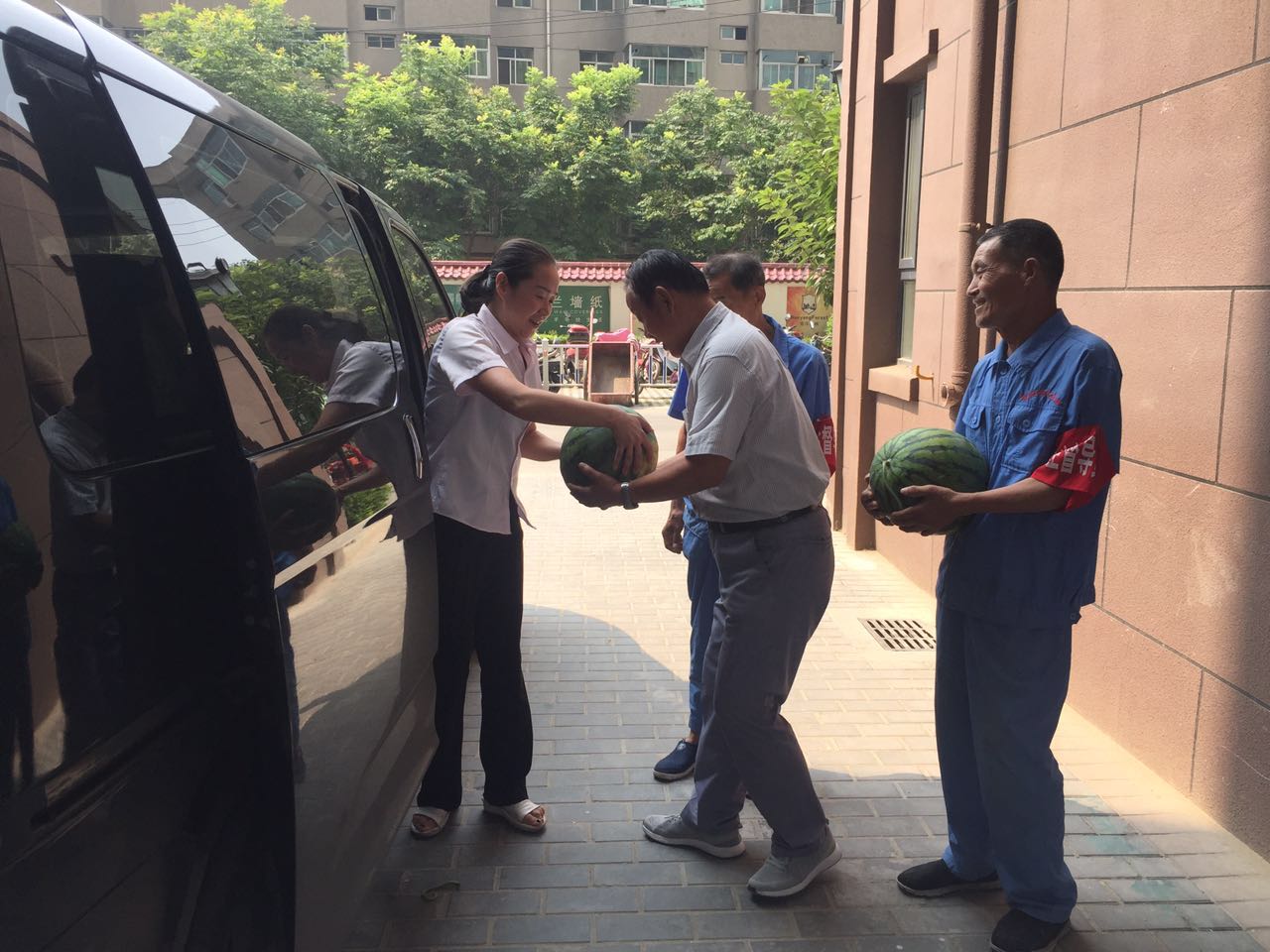 當日上午,總經理趙明海、工會主席常紅艷等人一行來到河南街、安谷苑、九冶、城投時代進行慰問,向一線職工送去800余斤西瓜。慰問組每到一處,親切詢問保安保潔的生活情況和工作狀況,叮囑他們要注意防暑降溫,并對保安保潔近期以來的勤懇勞動表示感激和關懷之情,叮囑他們在開展“創文”整治工作以來,保潔員隊伍人員少、天氣熱、任務重的情況下,在提高小區環境質量的同時,要做好遮陽等保護措施,注意勞逸結合,預防中暑。
