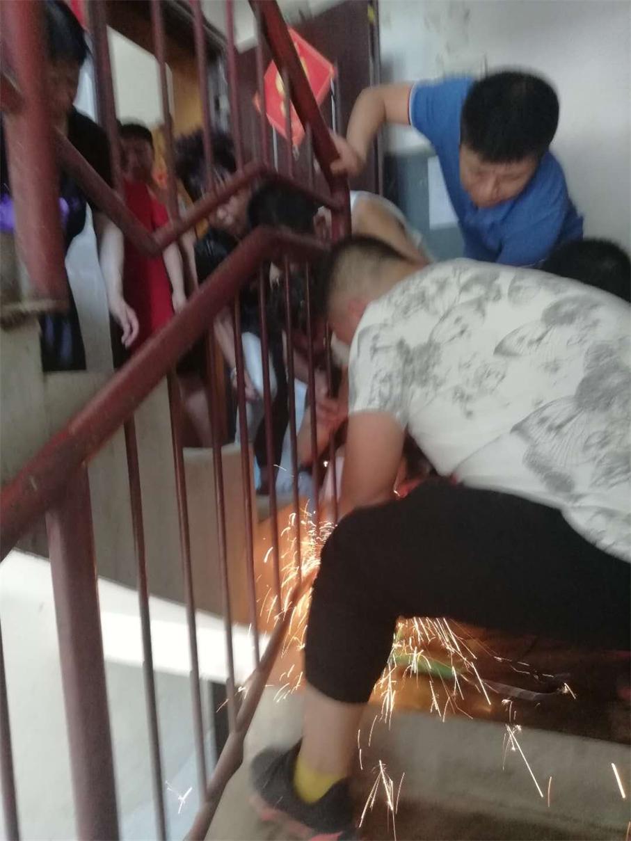 為避免孩子再次受到傷害,維修人員事先對小男孩的頭部做了適當的保護,隨后,用切割機將護欄切割開,隨著“咔嚓”兩聲輕響,一分鐘不到,欄桿鋼條兩端被割斷。5點25分,小女孩毫發未損,安全脫身。所有的人那顆懸著的心總算放了下來。