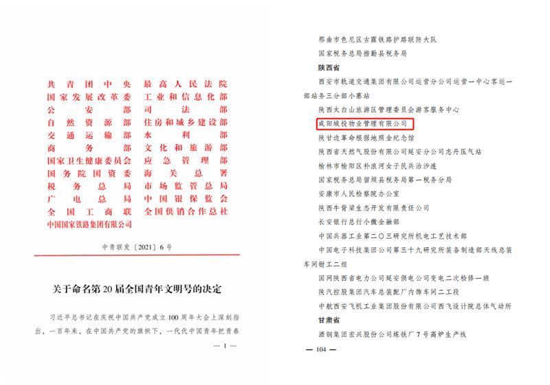 在2019—2020年度全國青年文明號創建評選中,咸陽城投物業管理有限公司憑借堅定的政治素質、良好的職業道德、專業的職業技能、過硬的工作作風、優秀的崗位業績獲得“第20屆全國青年文明號”榮譽稱號!